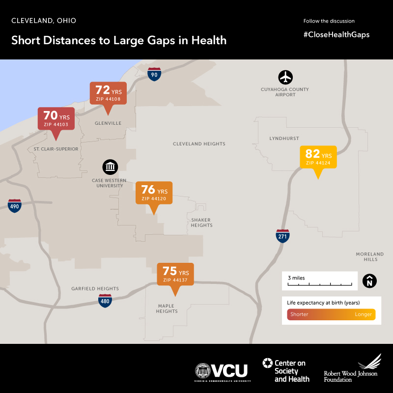 The aim of these maps is to serve as a resource—raising awareness of factors that shape health and spurring discussion and action on a complex web of factors that influence health. In this case, the average life expectancy in zip code 44103, near St. Clair-Superior, is 70 years - 12 years shorter than for babies born a short drive away in zip code 44124, near Lyndhurst.