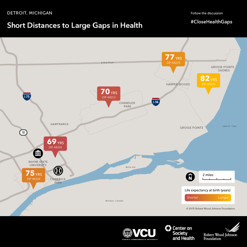 The aim of these maps is to serve as a resource—raising awareness of factors that shape health and spurring discussion and action on a complex web of factors that influence health. In this case, the average life expectancy in Midtown is 69 years, 13 years shorter than for babies born in the Grosse Pointe area, just a few miles up I-94.